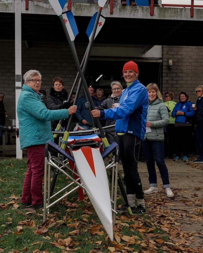Met roeien heb ik het genoegen gehad om passende roeischoenen via een clicksysteem in de skiff Creusa te mogen uitproberen… wat een comfort… wordt vervolgd…! Hierna weer in de te grote schoenen geroeid… wat een verschil… Opnieuw 8 nieuwe roeiriemen (Concept 2) met een delegatie van het Driemteam geschilderd in een recordtijd, 1 dag schuren, afplakken, schilderen, en na 3 droogdagen de wapenstickers van Roermond secuur bevestigen en Ready voor gebruik!…