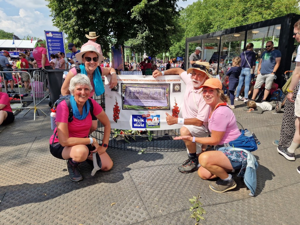 Wij wandelen van Maastricht naar Eijsden, en in het Nationaal Park de Hoge Kempen lopen we een prachtige route, over de bekende lange brug over het water… het is veel stijgen en dalen, dus een pittige laatste training voor de Walk of the World in Nijmegen! En dan is het weer zover… de 4 Daagse, een hele week logeren bij de gastvrije M & M in St Hubert… 4 Dagen 30 km wandelen met nog 45.000 andere wandelaars, in een geweldige sfeer met jong en oud! Het 4 daagse virus heeft me te pakken! Ook de Pippinsoep is present, we genieten van het mooie weer, mooie mensen, mooie routes en mooie wandelslierten… Enkele blaartjes heb ik gelukkig goed onder controle… En dan… op de laatste wandeldag, ontvangen we de Kroon op onze inzet… een medaille mét kroontje! A. staat langs de kant om ons te verblijden met gladiolen! Superleuk, volgend jaar loopt ze de 50 km. Bikkel!