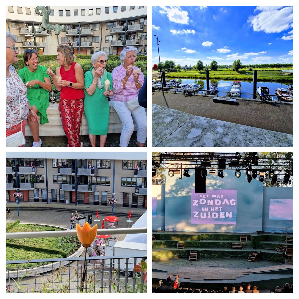 Vanwege een reeds lange tijd aanhoudende forse wind besluiten we onze demontabele windschermen aan te brengen. Zo ook halen we de hangmat “uit de mottenballen”. Op het binnenterrein worden voorbereidingen getroffen voor het “Residence Solea Plein Feest” van a.s. zaterdag. De koelwagen is al druk doende met het koelen van de diverse alcoholische en non-alcoholische versnaperingen. Vrijdag hebben we een middag vullend programma met de kids. Treinreis richting station Swalmen v.v.. Bijwonen van twee voorstellingen uit het programma van “Limburg Festival”. Smullen van zelfgemaakte pannenkoeken en een ijsje na op ons balkon. Tevreden keert daarna een ieder terug naar huis. Wij doen nog even een poging, op het terras van ons stamlokaal, tot een evaluatie van de voorstellingen. Op weg naar huis worden we nog even verleidt tot een drankje bij de buurvrouw, in gezelschap van enkele, ook nog wel een glaasje lustende, dames; samen de groep “Goldies” vormende.
