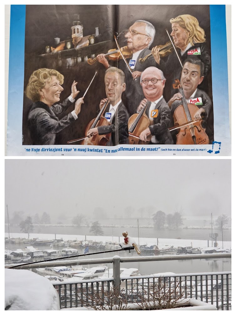 Zaterdag is het tien jaar geleden dat P.’s moeder overleed. Met het plaatsen van een grafstuk herdenken we dit feit. ’s Avonds stappen in “De Maaspoort”, Venlo’s theater, en genieten onder andere van bariton en gastheer Sef Thissen tijdens Viva Classic Kerst. Onder de inspirerende leiding van dirigent Maurice Luttikhuis brengen The New Symphonics en het koor Coro Classico een hartverwarmend programma met klassieke kerstliederen en geestelijke favorieten, van Bach tot Bing Crosby. Zondag, “leg ik me nog even op een oor” als P. in alle vroegte in de Roerdomp haar borstcrawlcursusbaantjes gaat trekken. Ik stap uiteindelijk, voor mij vroeg, uit bed om in de rij te gaan staan voor kaartjes “Loup nao de Pómp 2026”, terwijl P. een bij-klets-herinneringen-ophaal-tocht met voormalige mede Andalusië-gangers wandelt. Ik maak onder een lekker zonnetje een rondje Roermond. Stap nogmaals de overvolle Winter-Fever-Arena binnen en neem het verstandige besluit braaf naar huis te gaan. Uiteindelijk “dirigeert” de “Maestro” ons richting “dromenland”.